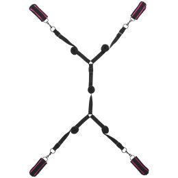 Lege die Gurte unter die Matratze und achte darauf, dass die Manschetten an jeder Ecke des Bettes herausschauen. Befestige die Manschetten mit frechen pinken Details an den Hand- und Fussgelenken deines Spielpartners, je nach Belieben mit dem Gesicht nach oben oder nach unten.
