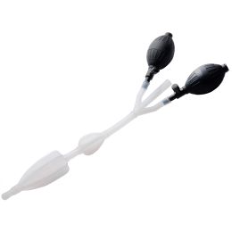 haben, dass die „Ballons“ schnell auslaufen oder kaputtgehen. Ich habe das noch nicht erlebt. Ich habe auch gelesen, dass die Pumpen von schlechter Qualität und schwer zubedienen sind. Ich denke, ansonsten funktionieren sie gut und sehr intuitiv, und sie können leicht ersetzt werden, wenn Sie es noch wollen. Insgesamt ist das Produkt vonguter Qualität. Der Schlauch zwischen den beiden Ballons ist verstärkt, sodass Sie den Fluss nicht durch Zusammendrücken mit dem Schliessmuskel unterbrechen können. Ein„Verbindungsstück“ ist nicht dabei, war aber bei mir auch nicht nötig. Der Schlauch ist so breit, dass ein handelsüblicher Klistierschlauch problemlos hineinpasst. DiePumpen haben zwei Einstellungen: „Geschlossen“, wobei Luft durch Drücken der Pumpe in die Ballons eindringen und nicht wieder herauskommen kann. Und „offen“, wobeidie Luft aus den Ballons entweicht, die sich somit auch nicht aufblasen lassen. Wenn sich die Ballons nicht aufblasen lassen, drehen Sie den Metallknopf an der Pumpe, da Siesich wahrscheinlich in der „falschen Einstellung“ befinden. Das Tolle an diesem Produkt ist, dass Sie sich während eines Einlaufs mehr entspannen können. Sie müssennicht ständig drücken, um das Wasser im Inneren zu halten. Und wenn Sie ein bisschen „böse“ sind, dann können Sie die Kontrolle an jemand anderen abgeben, derentscheidet, wann Sie das Wasser abstellen dürfen. Solange der Ballon aufgeblasen ist, kann Wasser nicht wirklich wieder herauskommen. Aber Vorsicht: Wenn Sie wirklichversuchen, den Ballon im aufgeblasenen Zustand herauszudrücken, dann können Sie es wahrscheinlich schaffen oder ihn vielleicht sogar „sprengen“. Das Produkt hat keinenschlechten Geruch, keine scharfen Kanten oder sonstige unangenehme Dinge. Probleme: 1: Das Produkt ist qualitativ nicht so hochwertig. An einigen Stellen hatte es ganz kleinebraune Verfärbungen, und ganz am Ende, wo das Wasser rauskommt, war der Schnitt nicht ganz sauber ausgeführt. Es gab keine scharfen Kanten, aber im Inneren des Schlauchsbefand sich etwas überschüssiges Silikon, das nicht vollständig entfernt worden war. 2: Das Produkt ist ziemlich gross. Ich kann nur den oberen Ballon einführen und danngeht das Produkt eigentlich nicht weiter hinein. Ausserdem sind die beiden Ballons meiner Meinung nach etwas zu weit voneinander entfernt, und diese beiden Probleme zusammenführen dazu, dass die Ballons die meiste Zeit nicht sehr nahe beieinander sind. Fast die ganze Arbeit wird vom inneren Ballon erledigt, während der äussere Ballon einenganzen Zentimeter vom Anus entfernt hängt und absolut nichts tut. Allerdings helfen dabei einige Positionen, z. B. auf den Knien mit dem Kopf nach unten. 3: Da das Produktziemlich gross ist, muss ich Gleitgel verwenden, um es sanft einführen zu können. Das geht zwar auch problemlos ohne Gleitgel, aber dann habe ich Angst, die Ballons zubeschädigen.