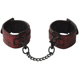 Die Manschetten aus weichem Kunstleder sind wendbar und haben ein Design mit Schwarz und rotem Rosenmetall, zwischen denen du wählen kannst. Sie sind an die meisten Grössen anpassbar, und die Schnalle ermöglicht es dir, die Fesselung an deine Wünsche anzupassen.